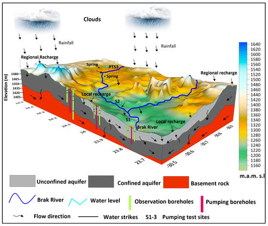 A 3D conceptual model explaining areas of potential recharge, both local and regional, and flow characteristics was created using the surface elevations and geology derived from drill log data (Figure 15). The study’s findings recommended a model consisting of two to three layers with varying hydrogeological properties: unconfined, semiconfined, and the basement aquifer [9]. In the lower and middle catchment areas, sand, clay, and gravel form the unconfined aquifer with a thickness ranging from 0 to 10 m. The underlying semi-confined aquifer is represented by low-permeable shale, with dolerite dominant in the lower catchment, as well as mudstone and sandstone, and has a thickness ranging from 15 to 50 m. A confined aquifer is covered above by low-permeability clay layers (aquitards) in the lower and middle catchments, and below by alternating mudstone and shale formations. In the upper catchment, stratigraphic data indicate impermeable layers both above and below the aquifer, limiting vertical flow and resulting in pressurized groundwater conditions (Figure 15). The bottom layer represents the basement aquifer, which is made up of dolerite formations situated below 50 m (Figure 15). The middle and upper catchments had thin alternating layers, whereas the lower catchment had a consistent thick layer of shale and dolerite. Higher elevations are where recharge occurs because of rainfall infiltrating into the subsurface. After that, the groundwater flows through the aquifer in a downward direction from the upper catchment (high elevation) to the lower catchment (lower elevation) (Figure 16). Groundwater discharge occurs as springs where the topography drops below the water table or where a confining layer pushes the flow to the surface (Figure 15). The borehole depth ranges from 13.5 to 60 m, depth to static water level from 3.32 to 4.77 m, water strike from 5.5 to 41 m, and the yield of 0.5 to 4.5 L/s. Yields exceeding 5 L/s can be found in the weathered and fractured shale and mudstone beneath the alluvial formation, particularly in areas where nearly complete calcification has occurred [17]. The Elandsfontein Spruit River, originating southeast of Hanover and the Brak River near Caroluspoort, along with several minor tributaries, drains the entire study area (Figure 15). The confluence of these two ephemeral river systems lies approximately 10 km northwest of De Aar town. These rivers typically flow briefly and mainly during and after heavy rainfall. Numerous slopes of dolerite hills frequently intersect the intermediate valley areas. The riverbeds lie above the groundwater table, leading to the formation of standing pools of water along the Elandsfontein Spruit and Brak River systems [10]. The lower catchment exhibited transmissive fractures and relatively low hydraulic conductivity, indicating limited groundwater movement and recharge (Table 3). Compared to the lower catchment, the middle and upper catchments exhibited moderate to high storativity and transmissive fractures, indicating greater water storage and release from the matrix, as well as faster groundwater transmission. Furthermore, the results indicate that local and regional recharge potentials predominate in the study area, with regional recharge sustaining groundwater availability. The lower catchment is dominated by regional recharge rather than local recharge, resulting in reliable groundwater allocation.