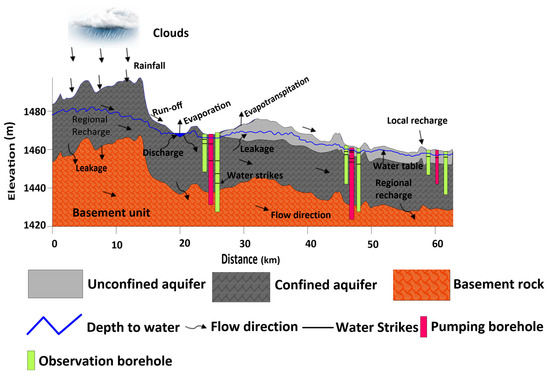 Figure 4 illustrates the litho-stratigraphic layers of the pumping test and observation boreholes used for the estimation of aquifer hydraulic parameters. The geological profile of the research study area was created using information from nine boreholes drilled along the Brak River system, which represented the lower, middle, and upper catchment regions. The data were obtained from the Department of Water and Sanitation’s (DWS) National Groundwater Archives (NGA) database system. The borehole data included lithology logs, borehole identifier, top-to-bottom depth of each layer, formation name of each layer, water strike depth, yields, and static water level (Table 2). Figure 3 shows the geological cross-sectional profile of the pumping and observation boreholes used for the estimation of aquifer hydraulic parameters and conceptualization of the study area. Firstly, surface elevation points were generated using the Google Earth Pro software program. Using Surfer Golden software version 16, the elevation points were converted into a grid of data points to infer geological formations and define the zones of groundwater recharge potential [11]. Subsequently, the profile line representing the desired cross-section path was created and used to slice the grid, generating a cross-sectional profile. For the processing, analysis, and interpretation of the lithology data, borehole logs were initially sorted using a Microsoft Excel spreadsheet to determine the top-to-bottom extent of each layer for the estimation of each layer’s thickness. The unconfined aquifer was measured from the confining unit at the aquifer base to the static water level. The semi-confined/confined aquifer was measured from the confining unit at the aquifer base to the confining unit at the aquifer top. The lithological correlation of each borehole log was analyzed to determine the lateral continuity of different layers, to establish the subsurface geological structures explaining different types of aquifers [31]. Finally, the cross-sectional profile was customized, labeled, and filled with layers using lithology logs.
