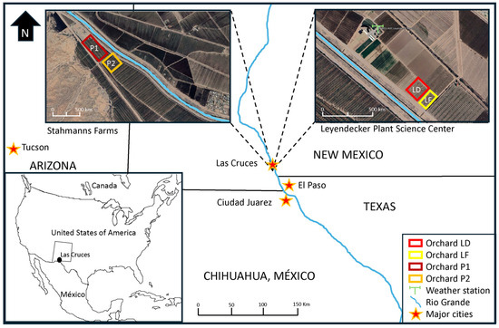 The study sites are located in the Mesilla Valley (Figure 1), which is part of the Rio Grande flood plain in southcentral New Mexico. The valley includes about 36,400 ha of bottom valley land where agriculture has been active for centuries [22]. This study was performed on four orchards (Table 1). Two sites are located at Leyendecker Plant Science Center, around 13 km southeast of Las Cruces, and the other two sites are at Stahmann farms, located 10 km southwest of Las Cruces.