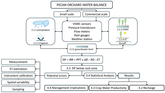 Furthermore, a significant and unaddressed socio-hydrological gap exists. The pecan farming community is socio-economically diverse, encompassing large-scale commercial operations and numerous small-scale, lifestyle-oriented producers. Current water management policies and data are predominantly derived from large-scale operations, creating a risk that they may be ineffective or inequitable if applied to smaller farms. The potential for differential water use and recharge between these distinct farm scales has never been investigated. Therefore, to address the general lack of field-based water budgets for pecans and the complete absence of data comparing farm scales, this study has a dual objective: (1) to quantify groundwater recharge rates and yields in pecan orchards under different irrigation systems and (2) to directly compare these hydrological functions between small-scale and commercial orchards.