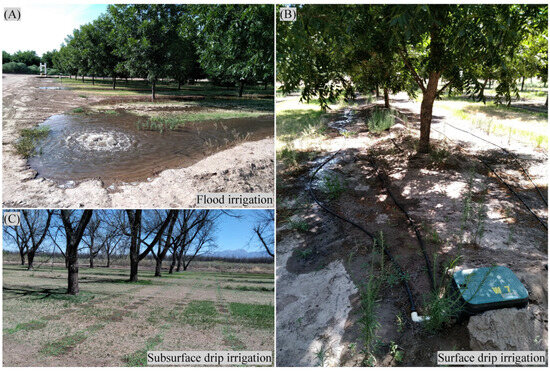 The orchards were irrigated mainly from pumped groundwater and a few irrigations with surface water from the Rio Grande. Orchards at Leyendecker were irrigated with groundwater, while the orchards at Stahmann were irrigated with groundwater and surface water when available. This water is managed and supplied to farmers by Elephant Butte Irrigation District (EBID) using a network of irrigation channels. Irrigation water from the well at Leyendecker Flood (LF) was measured with a metered pipe (McCrometer, Inc. Hemet, CA, USA) where the total volume of water was discharged directly from the valves installed in the orchard. The pecan orchard at Leyendecker Drip (LD) was irrigated by a surface drip irrigation system (Figure 3).