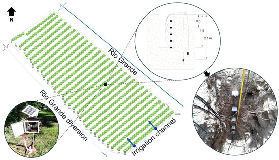 Observation wells were installed to monitor the groundwater level at the sites. The wells were installed at Leyendecker and Stahmann with a depth of 5 m below the ground surface on each site. Manual measurements were taken with a water level indicator (DGSI Tucker, GA, USA) during field visits every week. In addition, groundwater data from different wells were analyzed in the area from the Elephant Butte Irrigation District (EBID) website [28]. Rio Grande flow data were also collected from this site at the River Gauge 5—Mesilla Cable. The depth of water in the area ranges from 15 to 23 m below the land surface.