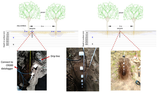 Similarly, 655 TDR sensors were installed at Stahmann farms. For the P1 orchard, seven sensors were installed below the drip lines to measure changes in VSWC, as shown in Figure 5. On the other orchard P2, the sensors were installed similarly as they were installed on P1. These sensors measured VSWC and continuously acquired data from June 2020 to December 2023 for Stahmann sites, while at Leyendecker, the sensors were installed in January 2020.