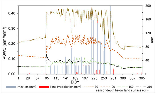 Volumetric soil water content (VSWC) measured in the sites was analyzed, and it is presented in Figure 6. The change in storage changed with every irrigation, with the sensors installed at 30 and 60 cm being the ones that have a higher change in water content. The sensors installed at 90 and 120 cm were not very susceptible to irrigation, and their water content changed less when compared to the near-surface sensors. The zone beneath the root system is characterized by a zero-flux plane, which hydrologically separates upward movement driven by ET from downward drainage driven by gravity [30]. A depth of 150 cm was established as the lower boundary for calculating changes in soil moisture storage. This depth was selected based on previous research by Miyamoto, S. (1983) [8], which characterized the root system distribution in similar soil profiles. Additionally, site excavations revealed no root presence below this depth, suggesting that ET contribution to soil water flux beneath 150 cm is negligible.