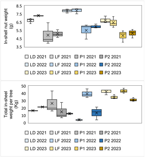 Yield data for the four sites during the study period. Total in-shell weight per tree and in-shell nut weight. The X represents the mean, showing that P1 2021 had the highest variability during the study period.