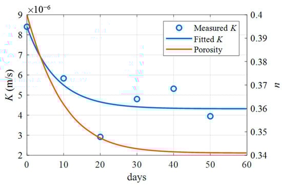 where t (s) is time, K0 (m s−1) is the initial hydraulic conductivity, p0 (m s−1) and p1 (s−1) are the parameters that needs to be fitted. According to the references [], the relationship between hydraulic conductivity and porosity is shown below,