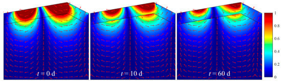 The contour maps of pore water velocity distribution in the hyporheic zone at different time points (t = 0 d, 10 d, 60 d). The red arrows represent the flow directions of pore water. The pore water flow velocity is expressed as relative Darcy velocity (u* = u/u0, u0 = 4 × 10−8 m/s), with darker colors (red) indicating higher velocities.