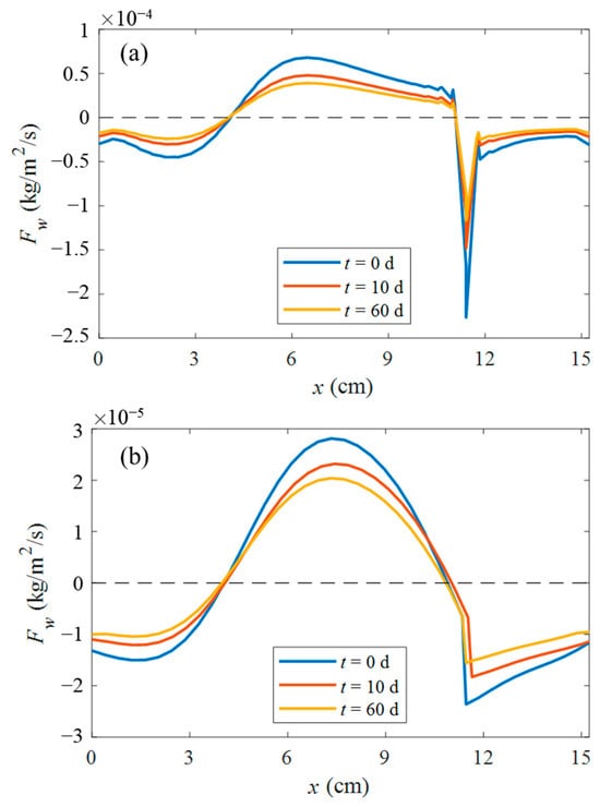 To systematically investigate the influence of dynamic layered clogging on water flux within the hyporheic zone, this study selected Case C for detailed analysis. Figure 4 presents the water flux across different interfaces of the hyporheic zone. Specifically, Figure 4a depicts the flux at Surface 1 (the interface between the overlying water and Layer 1), while Figure 4b represents the flux at Surface 2 (the interface between Layer 1 and Layer 2). All fluxes are defined as positive downward and negative upward, and the directions are shown in Figure 1. As shown in Figure 4a, the positive flux of water entering the hyporheic zone from the overlying water primarily concentrates on the stoss side (x < 11.4 cm), peaking at x = 6.5 cm. At the initial time (t = 0), the peak flux is relatively high, reaching 7.1 × 10−5 kg m2 s−1. When t = 10 d, due to microbial growth and biofilm-induced clogging in the hyporheic zone, both the hydraulic conductivity and porosity of Layer 1 go downwards, leading to a reduction in the peak flux to approximately 4.8 × 10−5 kg m2 s−1. At t = 60 d, microbial growth stabilizes, and biofilm-induced clogging in Layer 1 reaches its maximum extent, causing the peak flux to further decline to 3.9 × 10−5 kg m2 s−1. Compared to the initial value, biofilm clogging reduces the total water flux entering the hyporheic zone by 45.1%. Figure 4b exhibits a similar trend, with the positive flux of water entering Layer 2 concentrated on the stoss side of bedform. The peak flux decreases from an initial value of 2.8 × 10−5 kg m2 s−1 to 2.0 × 10−5 kg m2 s−1 when biofilm clogging stabilizes (t = 60 d). This corresponds to a 28.6% reduction in total flux entering Layer 2 compared to the initial condition. A comparison between Figure 4a,b reveals that the peak positive flux at Surface 2 is shifted further to the right (x = 7.5 cm). This shift occurs because, on the upstream side, water predominantly enters the hyporheic zone in a downward-rightward direction (Figure 3).