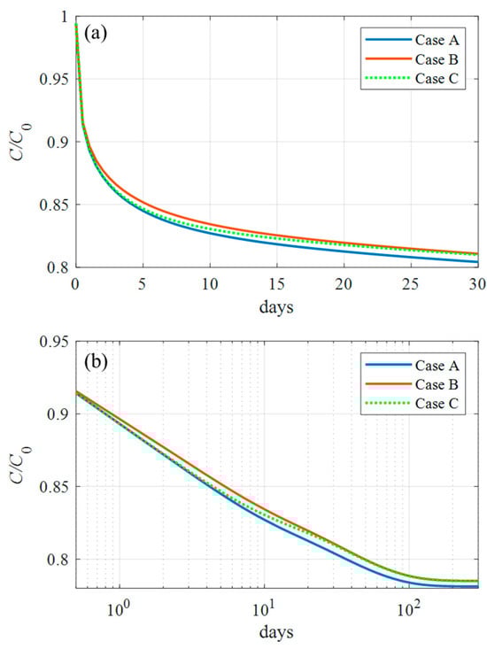 Temporal variations in relative concentration (C/C0) of non-absorbable solutes in overlying water. (a) The x-axis is linear time (days); (b) The x-axis is logarithmic time (days). Three curves represent Case A (no biofilm, constant hydraulic parameters), Case B (Layer 1 with maximum clogging, constant parameters), and Case C (dynamically changing parameters in the Layer 1).