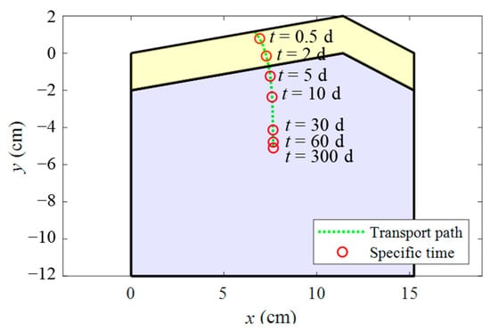 Transport path of the solute CMD in the streambed for Case C. The x-axis is horizontal distance (x, unit: cm), and the y-axis is depth (y, unit: cm, negative values indicate depth within the hyporheic zone). The solid line is the transport trajectory of CMD, with positions at different time points (t = 0.5 d, 2 d, 5 d, 10 d) marked by dots. Results show that CMD moves downward rapidly in the initial stage (0–5 d), breaking through the Layer 1 into the Layer 2 at t = 5 d; the depth decreases by approximately 1.8 cm within 10–30 d; movement slows after 60 d, with a decrease of only 0.4 cm within 300 d.