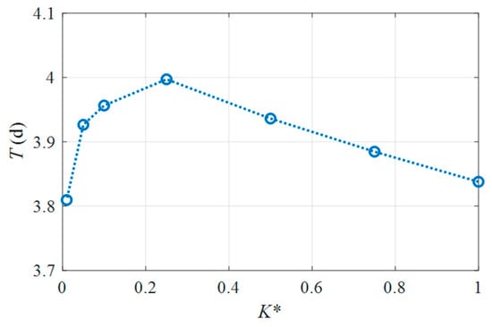 Based on the penetration time and arrival time patterns in Table 2 and Figure 9, this paper hypothesizes that as the hydraulic conductivity in Layer 1 becomes smaller, the flow velocity will decrease, i.e., the penetration time of CMD will be prolonged. To verify this hypothesis, this paper conducts multiple sets of simulations with different scaling factors for the hydraulic conductivity in Layer 1, with the porosity (n) also adjusted according to Equation (3). K* represents the scaling factor for K0, that is, K* = K/K0 (this paper selected seven sets of K*, which are 1.0, 0.75, 0.5, 0.25, 0.1, 0.05, and 0.01). Figure 10 shows the penetration times corresponding to different K*. As can be seen from Figure 10, when K* > 0.25, the penetration time indeed increases over time as the hydraulic conductivity coefficient decreases. Starting from the initial T = 3.838 d when K = K0, it gradually decreases to T = 3.995 d when K = 0.25 K0, with the penetration time increasing by approximately 4.09%. However, as K continues to decrease (K* < 0.25), the penetration time of CMD becomes positively correlated with K*. This is because as the hydraulic conductivity coefficient decreases, the porosity is also decreasing. Although the decrease in porosity does not affect Darcy’s flow velocity in porous media, it does increase the actual flow velocity (actual flow velocity v = u/n). Therefore, when the porosity decreases to a certain extent, the reduction in the hydraulic conductivity cannot resist the increase in actual flow velocity caused by the decrease in porosity, and thus, when K* is sufficiently small, the reduction in the hydraulic conductivity will actually accelerate the penetrating process of CMD in Layer 1.