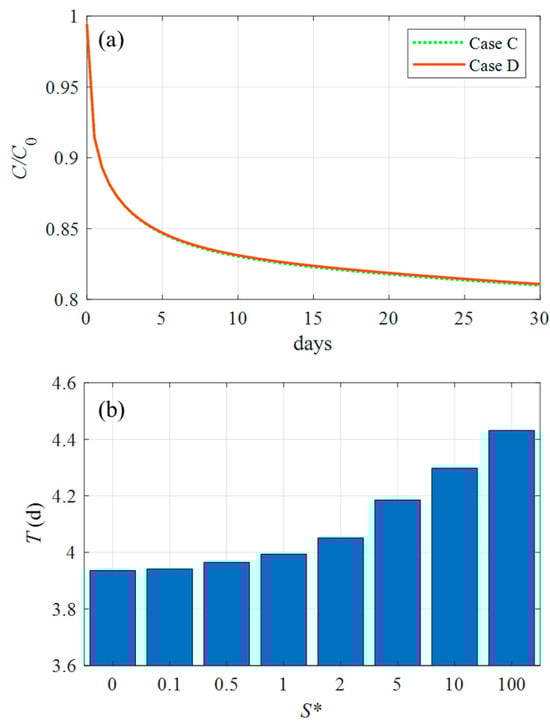 Effects of anaerobic microbial growth in Layer 2 on non-absorbable solute transport. (a) Temporal variations in non-absorbable solute concentration in overlying water under Case C (without considering anaerobic microbial growth in Layer 2) and Case D (considering anaerobic microbial growth in Layer 2). (b) Relationship between the hydraulic conductivity reduction rate multiplier (S*) and solute penetration time (T). S* represents the multiple of p1 in Equation (6), where S* = 1 corresponds to Case D (identical reduction rates in Layer 1 and Layer 2) and S* = 0 corresponds to Case C (constant hydraulic conductivity in Layer 2).
