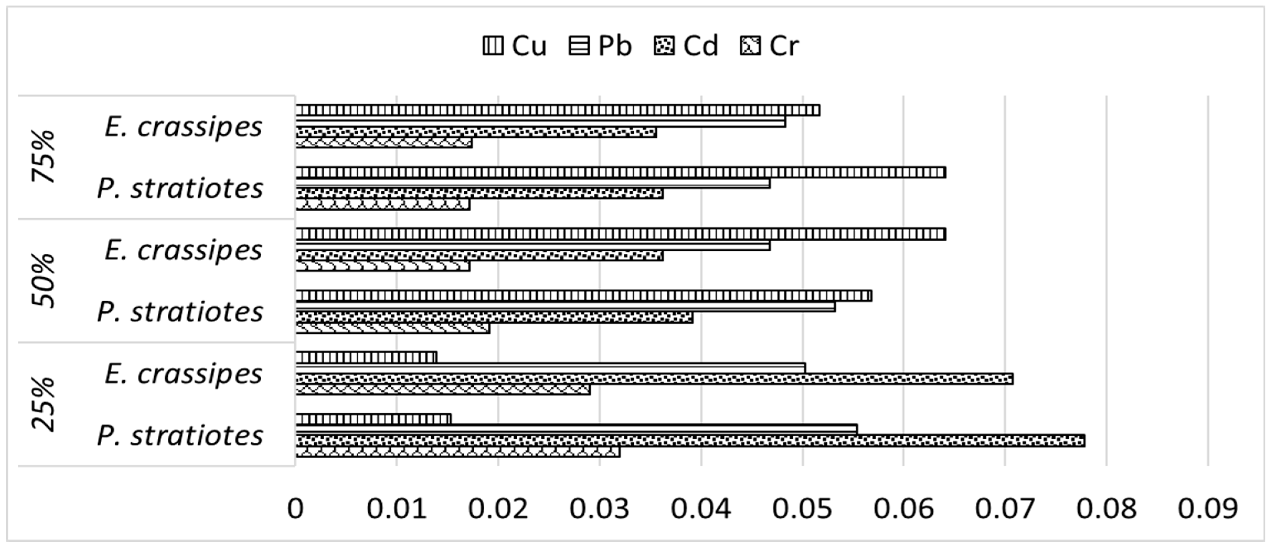 3.2.2. Heavy Metal Conc. in Roots and Shoots of P. stratiotes and E. crassipes and Their Phytoremediation Performance