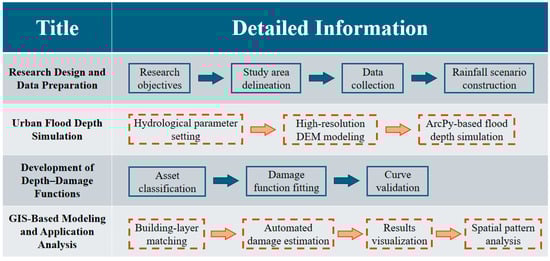 This section describes the technical framework developed to simulate urban waterlogging depths and estimate building-level economic losses. The methodology integrates rainfall scenario simulation, water depth calculation using DEMs, the construction of depth–damage functions for residential and commercial buildings, and the implementation of a GIS-based automated loss estimation model.
