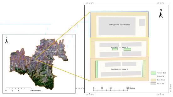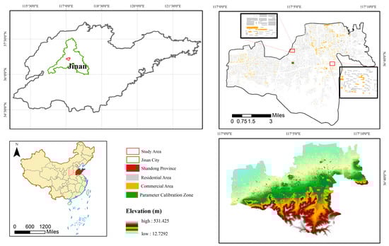 To construct waterlogging depth–damage functions suitable for GIS-based urban waterlogging assessment models [10,19,26], this study selected two typical residential communities and one underground commercial supermarket in the Yaojia Subdistrict, Lixia District, Jinan, as parameter calibration areas. Asset structure and historical waterlogging impact data were collected to fit separate damage curves for residential and commercial buildings. As shown in Figure 4, the selected area is located in Jinan’s central urban zone, characterized by high building density, weak drainage infrastructure, and a terrain that slopes from east to west, making it prone to water accumulation. The underground supermarket is a closed space, highly vulnerable to waterlogging.