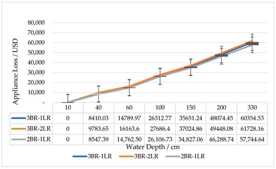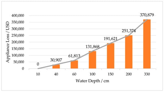 A central innovation of this study lies in the explicit differentiation of residential and commercial building loss functions. For the residential sector, data were sourced from real-estate platforms and complemented by on-site surveys, which revealed that the study area primarily consists of three typical apartment layouts: three-bedroom and one-living room (120 m2), two-bedroom and one-living room (100 m2), and three-bedroom and two-living room (140 m2), all characterized as reinforced concrete frame structures. Consequently, residential losses were modeled to include expenses related to flooring and wall refurbishment at different inundation depths, repair or replacement of household appliances, and temporary resettlement costs for affected residents. Each cost component was parameterized based on local consumption levels, household appliance penetration rates, and official government reports, ensuring a realistic representation of potential losses. By contrast, commercial facilities, such as underground supermarkets, were modeled using a rule-based piecewise loss function approach that accounted for inventory damage, elevator malfunction, power generator failure, and air-conditioning equipment loss. This dual-structured framework improves model applicability by capturing the heterogeneous vulnerability of urban assets and highlights the importance of distinguishing residential and commercial contexts in waterlogging risk assessments.