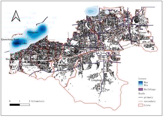 The spatial heatmap of building losses (see Figure 8) revealed that high-risk areas were concentrated in low-lying northwest zones. This spatial concentration of waterlogging hazards is closely related to the underlying topography and drainage system configuration, suggesting that further analysis is needed to understand the driving factors behind these patterns, such as those around Daming Lake, where average water depths exceeded 1.2 m, and single-building residential losses surpassed USD 41,208.79.