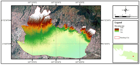 This study was conducted in Bandung, the capital city of West Java Province, Indonesia. Geographically, Bandung is located within a tectonic basin surrounded by volcanic highlands, creating a topographical structure that resembles a large bowl or basin. This natural bowl-shaped formation causes water from the surrounding uplands to flow and accumulate toward the city center during periods of heavy rainfall. As a result, Bandung is highly susceptible to urban flooding, particularly in low-lying areas where drainage is inadequate. The city also experiences high rainfall intensity, especially during the monsoon season, which further exacerbates flood risk. Combined with rapid urbanization and the expansion of impervious surfaces, the natural topography significantly contributes to the frequency and severity of localized inundation in Bandung. Figure 1 illustrates the administrative boundary of the study area, covering the urban extent of Bandung City.