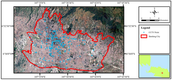 Since 2021, a public service (Dinas Komunikasi Dan Informatika Kota Bandung, Bandung, Indonesia) has been launched allowing 24 h live access to CCTV feeds operated by several government agencies in the city of Bandung. As of the time of this study, approximately 340 CCTV observation points are available citywide, with the number steadily increasing each year. These CCTV systems are primarily used for monitoring traffic congestion and surrounding weather conditions. In addition, several CCTV units are already integrated with advanced technologies such as vehicle counting algorithms, facial recognition systems, Network Video Recorders (NVR), and Pan–Tilt–Zoom (PTZ) features, enabling full 360-degree field coverage. The spatial distribution of CCTV observation points across Bandung City is presented in Figure 2.