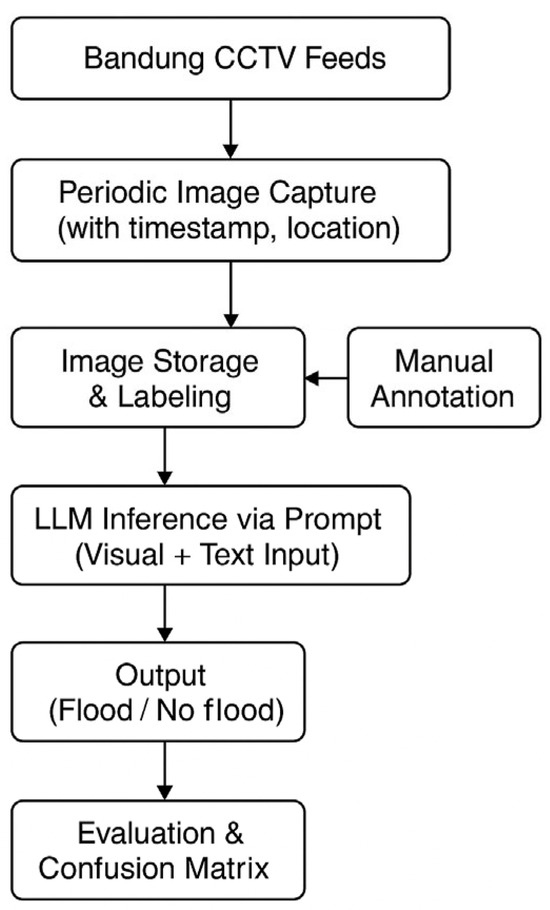 This study proposes a novel framework for urban flood detection by leveraging open-access CCTV data in combination with the visual recognition capabilities of multimodal LLMs. The method comprises three steps: image acquisition, manual labeling, and LLM-based prediction. Each step is designed to ensure a scalable, low-overhead approach suitable for real-world urban flood surveillance in data-constrained environments.