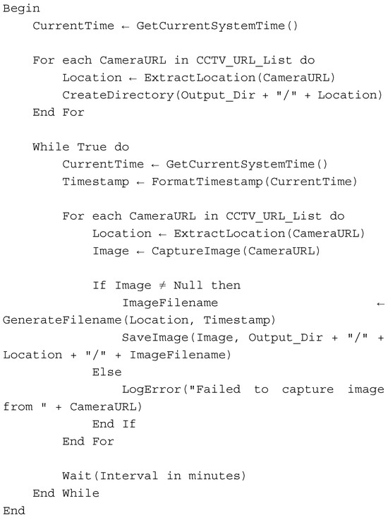 The first stage involves collecting visual data from publicly accessible CCTV feeds operated by the city of Bandung, Indonesia. These feeds are available through the online municipal monitoring portal, https://pelindung.bandung.go.id/ (accessed on 1 October 2023). A set of strategically selected CCTV cameras was targeted, particularly those located along flood-prone roads or intersections. At regular intervals, an HTTP request was initiated to capture still images from these feeds. For each image, metadata such as the timestamp and the geographical coordinates of the camera location were recorded. The images were then organized into a structured dataset, which served as the foundation for the subsequent analysis. Figure 4 illustrates the pseudocode used to systematically acquire images from all CCTV sources.