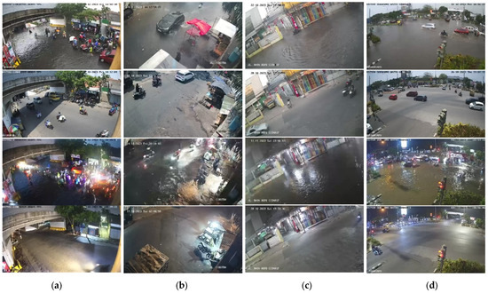 Example of labeled CCTV images used in this study. (a) The first row shows flood—day conditions, (b) the second row shows no flood—day conditions, (c) the third row shows flood—night conditions, and (d) the fourth row shows no flood—night conditions.
