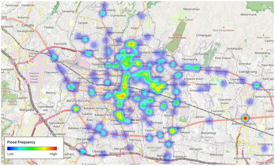 Despite the current limitations, the system developed in this study presents several promising opportunities. First, although the system currently only classifies images as either “flooded” or “not flooded”, it can still serve as a useful validation source for urban flood models. While the estimation of water depth using LLMs has not been tested in this study, the binary outputs provide valuable spatiotemporal data regarding flood presence and duration. From this information, it is possible to estimate the persistence of surface flooding at specific locations over time. An example of this potential is illustrated in the generated heat map, see Figure 7, which was produced using image classification results from 340 CCTV points across the study area. The heat map reflects the frequency of flood detections over the monitoring period. Although this frequency does not represent distinct flood events, but rather the total number of flood-labeled images, it still provides insights into spatial flood exposure and identifies locations that are frequently inundated. It is important to acknowledge that the accuracy of the LLM used in this process is approximately 85%, leaving a 15% margin of classification error. Therefore, the current heat map should be considered a preliminary representation, subject to refinement through improved model accuracy and future validation efforts. The flood occurrence information derived from CCTV classification results provides several practical benefits. First, it enables decision makers to quickly identify areas that are frequently inundated, thereby supporting more effective flood response and resource allocation. Second, the spatial and temporal patterns revealed by this information can serve as valuable input for the calibration and validation of hydrodynamic or flood forecasting models, particularly in data-scarce urban environments. Third, by leveraging existing CCTV infrastructure, the information enhances situational awareness and supports continuous urban flood monitoring without the need for costly new sensor deployments.