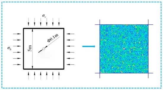 To clarify the effect of water hammer pressure waves on the extension of coal seam fractures, a plane surrounding rock numerical model measuring 5 m × 5 m was established using discrete element simulation software PFC 5.0. A fracturing hole is set at the center of the numerical model, with the size of the fracturing hole specified as Φ100 mm. The numerical model is shown in Figure 2.