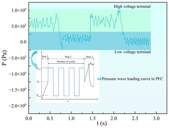 The static initial boundary conditions of the model involve applying displacement constraints and static stress boundary conditions around the model. A static load of 5 MPa is applied to the model boundaries during the simulation. The model’s dynamic boundary condition at the fracturing hole is set as the shock wave generated by the water hammer effect. To study the influence of the water hammer shock waveform on the fracture extension pattern during cracking, the monitored shock waveform from the experiment is simplified to establish a pressure waveform that highlights the water hammer pressure fluctuation pattern. As shown in Figure 3, the shock wave pressure curve in the model is simplified into a rectangular waveform.