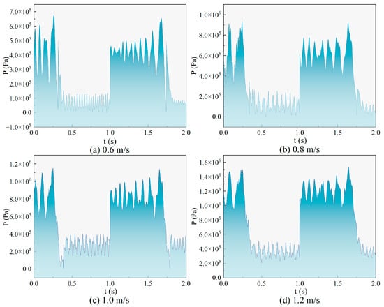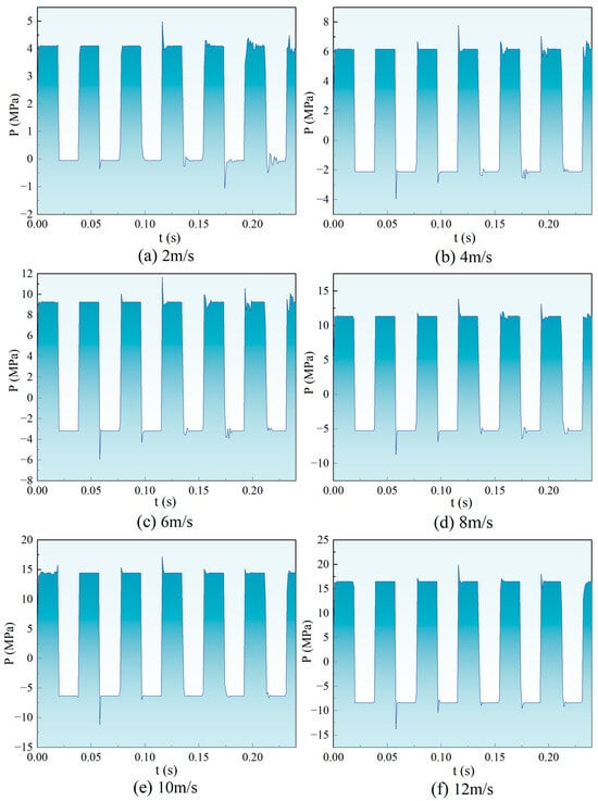 Figure 7 illustrates that the pulse water hammer pressure waveforms under different initial conditions exhibit a consistent pattern. However, the amplitudes of pressure fluctuations between the high- and low-pressure regions differ. As the fluid flow velocity increases, the peak pressure of the water hammer shock wave also rises. At an initial flow velocity of 6 m/s, the pressure can jump to 8.38–11.68 MPa; at 8 m/s, it can reach 10.62–13.89 MPa. It is observed that a secondary pressure rise occurs at the end of each water hammer shock wave impact on the pipeline, with the secondary pressure increase occurring in a brief, alternating manner. This phenomenon is attributed to the sudden obstruction during fluid motion, which triggers an instantaneous water hammer effect, driven by inertia and the superposition of reflected pressure waves.