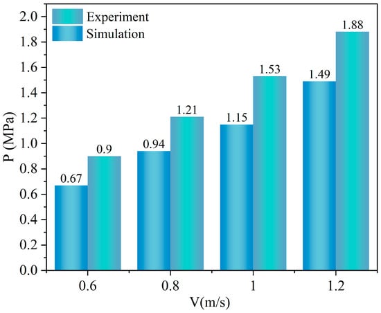 Before conducting simulation studies, it is necessary to verify the reliability of numerical simulation results through mathematical model validation. In conjunction with water hammer experimental research, initial conditions of 0.6, 0.8, 1.0, and 1.2 m/s were selected to explore the water hammer pressure generated by the instantaneous closure of a valve under stable water flow conditions.