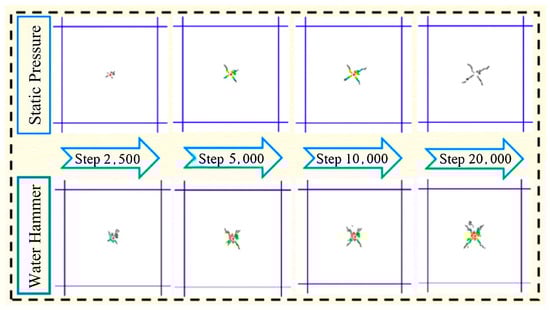 By comparing the fracture evolution process under static pressure and water hammer pressure in Figure 8, it can be observed that under both static and water hammer pressures, the coal body generally produces two main fractures extending through the fracturing holes, presenting a “butterfly-shaped” morphology extending towards the distal end.