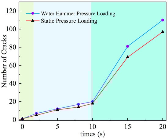 As shown in Figure 9, during the crack initiation stage, the difference in the number of cracks under different pressures is small, and the initial number of cracks mainly depends on the model and parameter settings, with little influence from the form of pressure application at this stage.