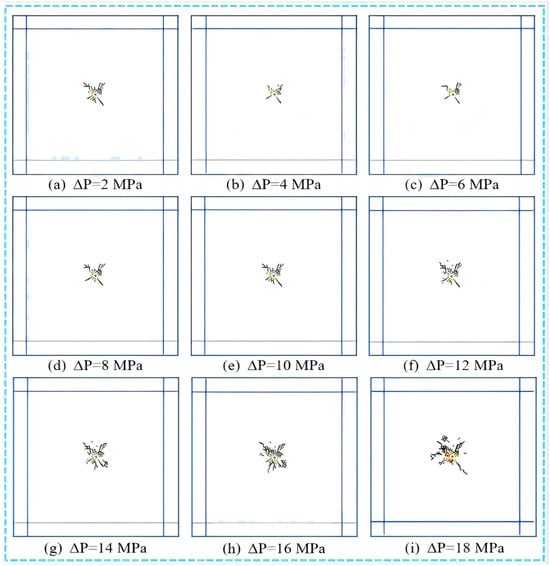 From Figure 10, it can be observed that the fracturing results vary significantly under different pressure amplitude loading conditions. As the pressure amplitude increases, the number of fractures and their extension range exhibit a clear increasing trend.