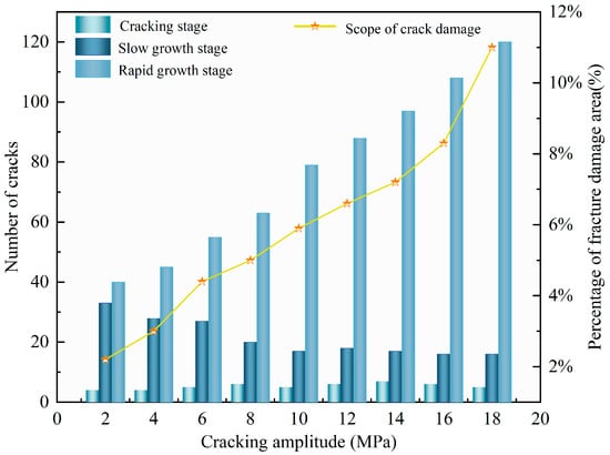 Figure 11 shows that during the initial fracturing stage, when the pressure amplitude is 2 MPa and 4 MPa, the number of cracks is four each. From 6 MPa to 18 MPa, the number of initial fractures ranges between 5 and 7, indicating that the number of initial fractures does not change significantly with increasing pressure amplitude at the early stage of fracturing. During the slow growth stage of cracks, the number of derived cracks reaches 33 at 2 MPa and 16 at 18 MPa. In this stage, the number of derived cracks decreases as the pressure amplitude increases. This is because when the pressure amplitude is large at the beginning of fracturing, the pressure rises rapidly, changing the stress field of newly formed cracks, preventing the pressure from fully propagating to distant areas, and quickly breaking the connections between nearby particles. When the pressure amplitude is small, crack extension is slow, forming more complex cracks around the borehole and increasing the number of cracks. In the middle and late stages of fracturing, the number of cracks increases with the increase in fracturing amplitude.