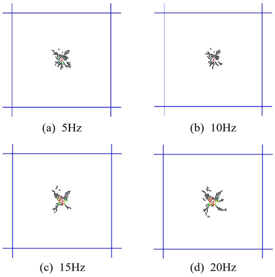 Previous simulation studies have shown that after a water hammer occurs, the fluid alternates between rising and falling within the output pipeline, and the characteristics of the output pipeline can affect the output frequency of the water hammer pressure wave. In this section, under the same pressure amplitude (10 MPa) loading conditions, the development patterns of fractures under different frequencies of 5, 10, 20, and 30 Hz are analyzed through simulations.
