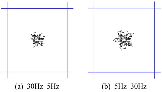 Figure 13 depicts fracture expansion patterns under variable frequency action. It shows that under the same geostress and pressure amplitude conditions, by alternately applying pulse frequencies of 5 and 30 Hz for fracturing coal, it is found that a segmented fracturing method starting with a 5 Hz frequency followed by switching to a 30 Hz frequency can more effectively promote the formation and expansion of cracks compared to other frequency combinations. This loading strategy, which starts with a low frequency and then switches to a high frequency, utilizes the differential effects of different frequencies on crack growth dynamics, optimizing the development of the fracture network and thus improving fracturing efficiency.