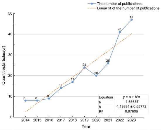 The Trend in Annual Publications on Ecological and Environmental Impacts of PHS (2014–2023), with the Linear Trend Line (y = 4.1939x − 1.6667, R2 = 0.8761).