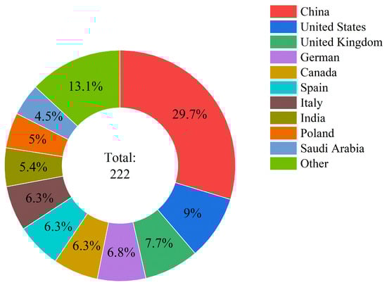 Analysis of national/regional publication volumes reveals the influence of different countries in this field. As shown in Figure 4, China ranks first with 66 publications (29.7% of global output), underscoring its leading role in PHS research, driven by supportive energy policies.