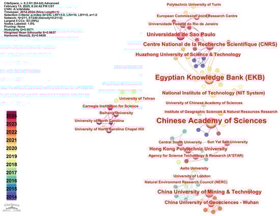 Based on CiteSpace 6.3 R1 analysis, the institutional collaboration network (Figure 5) comprises 214 nodes and 248 links, with a network density of 0.0109. Node size corresponds to publication volume, color indicates publication year, and connecting lines represent collaborative relationships. Key contributors include the Chinese Academy of Sciences (9 articles), Egypt Knowledge Bank (7 articles), National Center for Scientific Research (4 articles), Jagiellonian University (4 articles), and University of São Paulo (4 articles). Most active institutions are research organizations and universities, focusing on thermodynamics, earth sciences, chemistry, marine/freshwater biology, green technologies, and interdisciplinary fields.