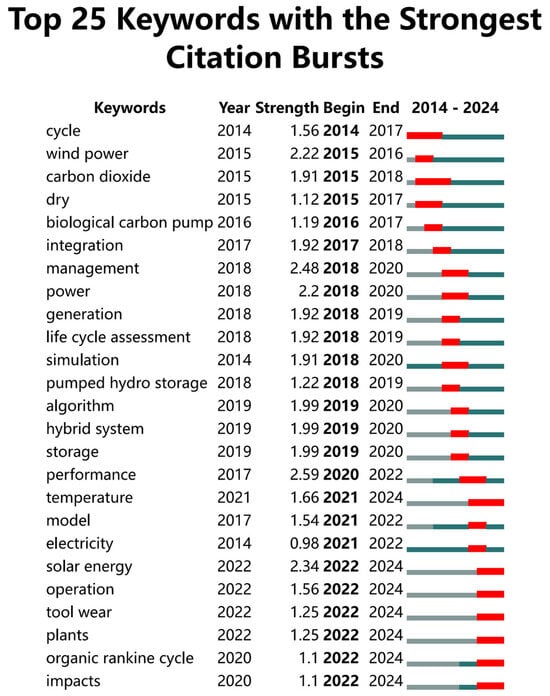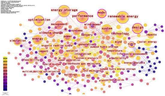 Combining the keyword co-occurrence network from Figure 6 and the frequency/centrality data in Table 4, the ecological and environmental impact assessment of PHS over the past decade has predominantly focused on keywords such as “renewable energy,” “performance,” “energy storage,” “optimization,” “model,” “design,” “system,” “wind power,” “technology,” “climate change,” “power generation,” and “impact.” Notably, research themes have concentrated on renewable energy integration (frequency: 28), energy storage optimization (frequency: 27), and system efficiency enhancement (frequency: 23), while keywords explicitly addressing ecological “impact” remain underrepresented (Table 4). This bias reflects a technology-driven research paradigm, with ecological dimensions significantly marginalized.