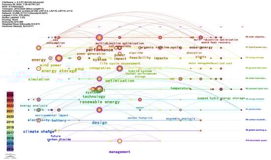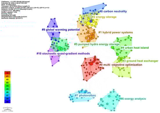 The keyword clustering network generated by CiteSpace 6.3 (Figure 7) reveals three core clusters in PHS research: multi-objective optimization (Cluster ID 0), hybrid power systems (Cluster ID 1), and energy storage (Cluster ID 2), which form a technology-dominated network through high-weight connections. In contrast, ecological themes such as global warming potential (Cluster ID 9) and carbon neutrality (Cluster ID 8) occupy peripheral positions with sparse connectivity to technical clusters.