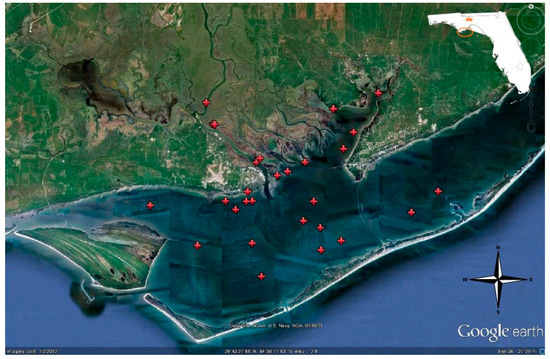 Apalachicola Bay, a bar-built estuary located in the northwestern coast of Florida, USA (Figure 1), is a highly productive system that supports an abundant recreational and commercial fishery [17]. The Apalachicola Bay system includes St. George Sound, East Bay and St. Vincent Sound, and is separated from the Gulf of Mexico by four islands: St. Vincent Island, Cape St. George, St. George Island, and Dog Island. Apalachicola Bay is approximately 63 km long,12 km wide, 2–3 m deep, and covers an area of around 539–542 km2 [17,18,19,20,21]. The average annual discharge of the Apalachicola River to the Bay between 1978 and 2016 was 38,640 m3/minute [22]. Freshwater and seawater inputs are derived mainly from the Apalachicola River and St. George Sound, respectively, with the former dominating over other currents in the bay. Water from the river disperses west of the Bay and exits to the Gulf of Mexico through the natural inlet West Pass [19]. Water exchanges with the Gulf also occur through natural inlets, including Indian Pass and East Pass, as well as artificial Sikes Cut, which separates the Cape St. George Island State Reserve from the western end of St. George Island.
