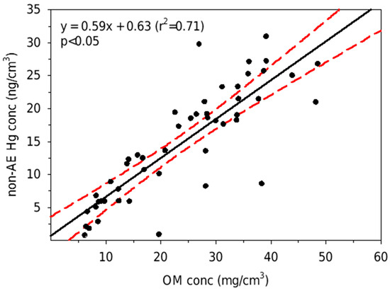 The correlation between the non-AE-Hg and the OM (linear regression in the black line) with the confidence level at 95% (the red lines) in the sediments of Apalachicola Bay, North Florida, USA.