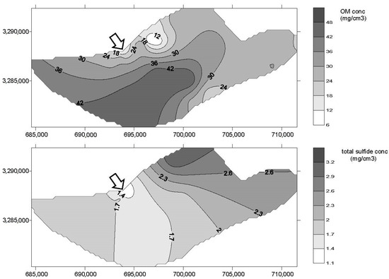 The spatial distributions of OM and total sulfides (AVS + CRS) in the sediments of the bay are presented in Figure 3. The OM was more heavily distributed in the southern area, whereas the total sulfides were more heavily distributed in the northeastern corner of the bay. The range of distribution of the total sulfides was relatively narrow in comparison to that of the OM.