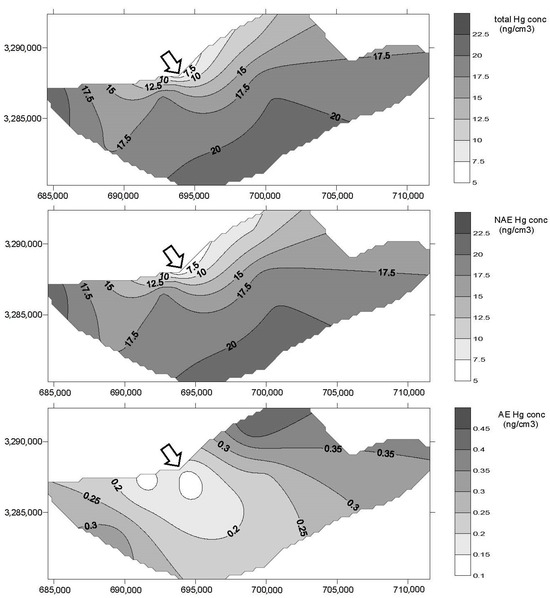 The spatial distributions of the total Hg, non-AE-Hg and AE-Hg of the sediments of the Apalachicola Bay, North Florida, USA. The arrows indicate the location of the river discharge.