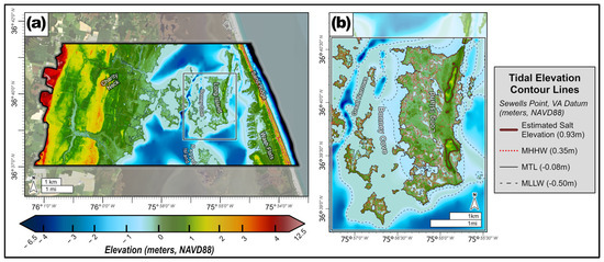 To facilitate compatibility with SLAMM’s use of Mean Tidal Level (MTL) vertical datum, the DEM was transformed from NAVD88 to MTL using NOAA’s VDatum software [46]. Details on the conversion process are described in Appendix A. The baseline topo-bathymetric DEM at the Bonney Cove project site overlaid with contour lines of MTL and other relevant tidal elevations above NAVD88 specific to Sewells Point is shown in Figure 2b.