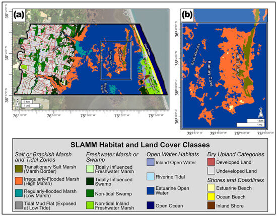 (a) Land and water cover NWI polygons converted to SLAMM classes for the SLAMM domain with a black and white rectangle outlining the project area of interest shown in (b), the baseline SLAMM habitat and land coverage conditions at Bonney Cove.