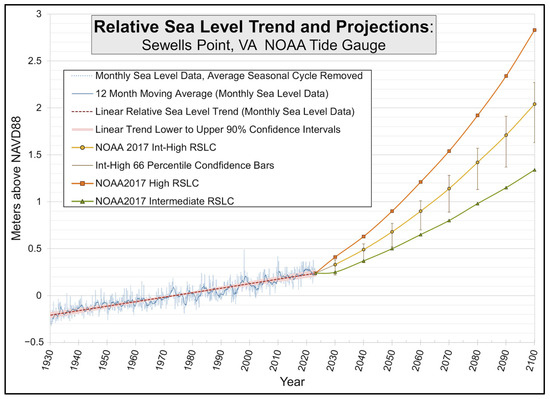 Historical monthly mean sea level plot recorded at Sewells Point, Virginia, shown without regular seasonal and year-long fluctuations. The relative linear trend of historical values is shown with a 90% confidence interval, followed by three NOAA [50] RSLC projections until 2100, obtained from the U.S. Army Corps of Engineers (USACE) Sea Level Change Calculator [52]. 66% confidence bands are shown for the Intermediate-High RSLC scenario, chosen for this study’s SLAMM simulations.