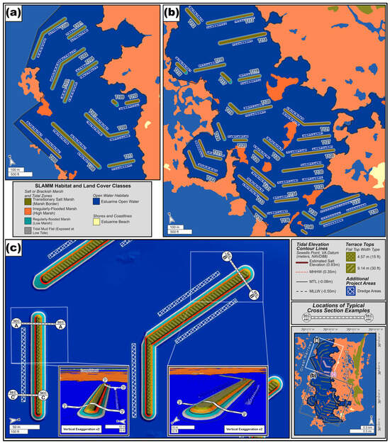The Bonney Cove project site covers about 2.3 km2 of shallow open water, historically more widely covered in marsh habitat [54]. The proposed restoration design features a network of marsh terraces– elongated islands formed from dredged sediment– strategically positioned in Bonney Cove to optimize the available marsh edge habitat, which is highly valuable to aquatic and avian species (Figure 5a,b). Native marsh vegetation species (e.g., cordgrasses, needlebrush, groundsel, wax myrtle, and bald cypress), identified from local surveys, have been designated for planting plans on top of the upper dredged sediment layer of the terraces above the waterline. Terrace patterns and densities at the project site reflect design priorities for maximizing edge-to area ratios while also modifying hydrodynamics (e.g., reducing wave energy, wave heights, flow velocity) by shortening wind fetches in the prevailing southernly wind directions. Rock armor will be installed on the side slopes to protect certain terraces exposed to open water in the north (T100, T101, and T105 in Figure 5a) and the south (T135, T137–T140 in Figure 5b). Prior modeling (i.e., XBeach) of the project’s individual element designs incorporated empirical site-specific observations, show how the marsh terraces are anticipated to increase friction against the movement of flood pathways, lowering water levels north of Bonney Cove by approximately 30%, reducing wave heights within Bonney Cove by approximately 45%, and have a slight influence on decreased flow velocities expected to promote submerged aquatic vegetation (SAV) growth in between the terraces [54,55].